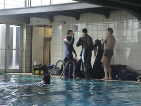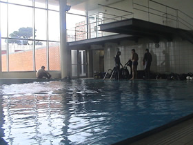 No sábado (04-Mar-2006) fomos à piscina da Pasteleira-Porto. Projectada para treino de mergulhadores, com 6m de profundidade e condições óptimas, fomos matar as saudades desde terça-feira (1º aniversário) e treinar para o 2º DIR-F do norte. Agora que o DIR-F tem dois "sabores" e os nossos estão interessados no "tech pass", o material de treino é um pouco maior: bis são obrigatórias, se forem "pesadas" (como são as nossas) então é obrigatório fato seco, lanternas principais com "canister" e sinais de luzes são obrigatórios, tal como o "backward kick" e o "helicopter turn".